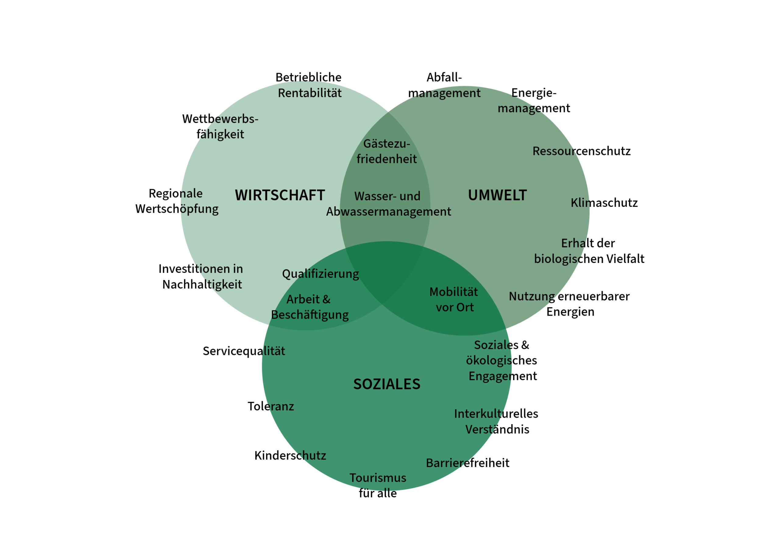 Eine nachhaltige, also zukunftsorientierte, langfristige und gesunde (Tourismus-) Entwicklung kann nur dann gelingen, wenn Ziele in den drei Dimensionen Umwelt, Wirtschaft und Soziales gleichermaßen berücksichtigt werden.