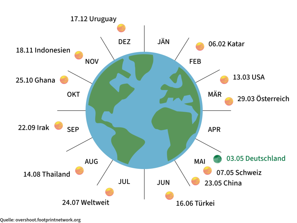 Datum, an dem die Erde ihre Jahresressourcen verbraucht hätte, wenn alle Menschen leben würden wie in … (Auswahl).